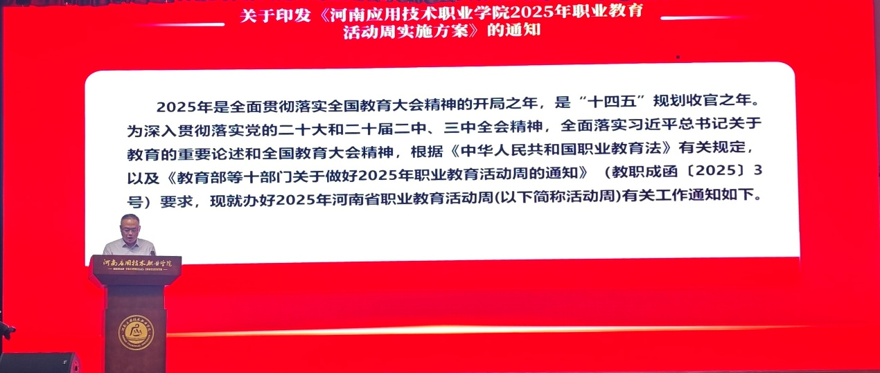启动仪式上,黄振中副校长宣读了职教周活动流程,介绍了包括宣传教育活动、线上线下体验、技能比武、招聘会等在内的丰富内容。薄新党校长致开幕词并宣布职教周正式开始。他在致辞中强调,职业教育是培养高素质技能人才的重要途径,希望全体师生以技能成才、技能报国为目标,践行工匠精神,书写青春华章。致辞内容深刻鼓舞了在场师生。