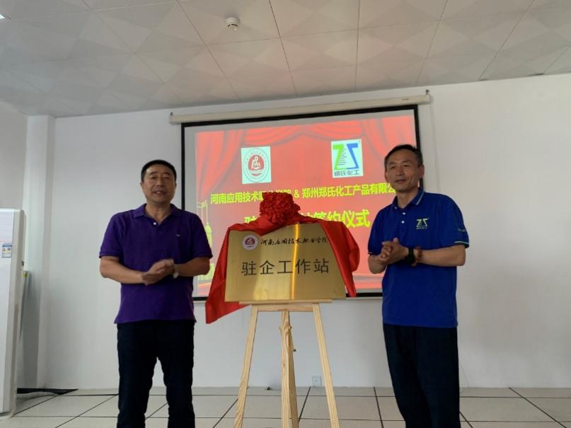 5月22日,beat365中文版官网入口“驻企工作站”在郑州郑氏化工产品有限公司(鹤壁基地)正式挂牌成立。朱冰与郑州郑氏化工产品有限公司(鹤壁基地)郑先祥总经理分别代表校企签订了合作框架协议书,并由蔡庄红代表学校与企业共同为“驻企工作站”揭牌。