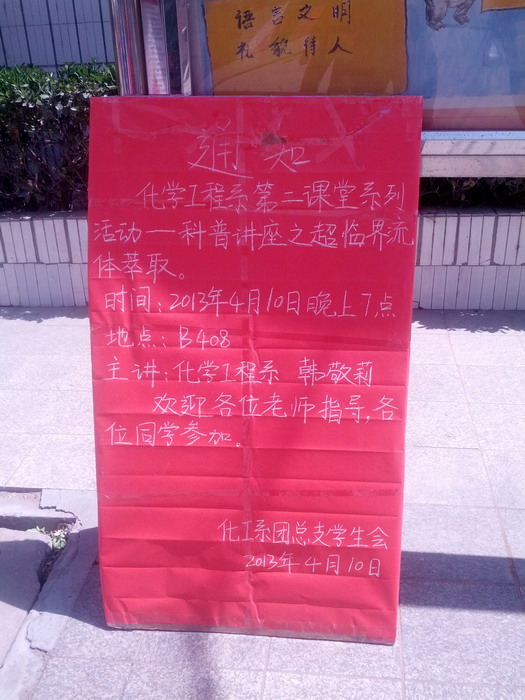 2013年4月10日,化学工程系在B408举行第二课堂活动——学术讲座。本次讲座由韩敬莉老师主讲。此次活动,由化学工程系副主任主持,共有38名学生参加。化工系副书记朱冰老师和马可颖老师听取了讲座。
