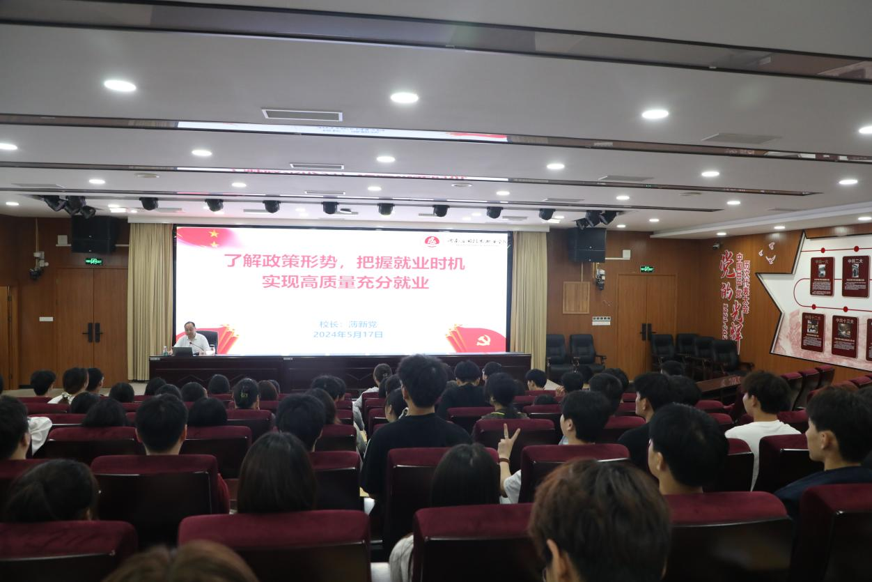为深入学习贯彻习近平总书记关于做好高校毕业生就业工作的重要指示精神,强化落实就业优先政策,引导青年学生认清就业形势、端正就业观念。5月17日下午,校长薄新党以“了解政策形势,把握就业时机,实现高质量充分就业”为题,在郑州校区思政大讲堂为beat365官网2022级精细化工专业学生讲授了一堂生动的思政课。