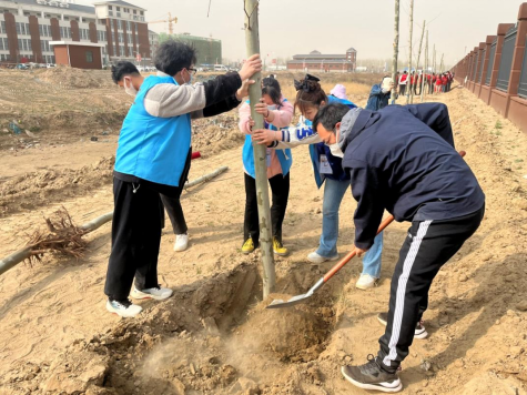 活动开始前,总支党员提前做好分工,准备铁铲、锄头、水桶等相应的植树工具。大家热情高涨,分工协作,配合默契,或两人一组,或三人搭档,搬运树苗、挥锹扬锄、扶苗提树、培实新土、取水浇灌,每一道工序都一丝不苟,以确保植树的质量和成活率。即使天公不作美,飞沙走石,但大家发扬不怕苦、不怕累的精神,劳作热情高涨、干劲十足,植树现场洋溢着团结协作、奋发向上的氛围。
