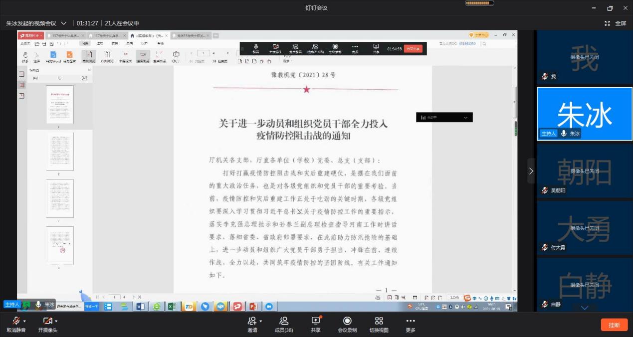近期新郑州冠肺炎疫情形势变化,根据校党委要求,2021年8月18日,beat365中文版官网入口党总支组织召开了学习《关于进一步动员和组织党员干部全力投入疫情防控阻击战的通知》线上专题会议,学院全体教职工参会。会议由院长朱冰主持。
