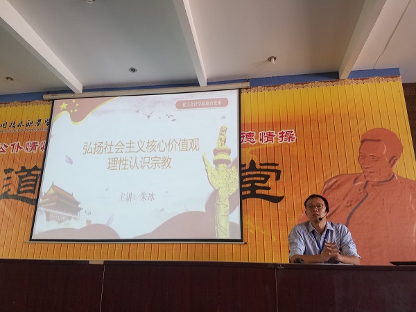 首先,朱冰书记从宗教的起源、宗教信仰、宗教的本质进行了详细的阐述,引导大家要客观的认识宗教。接着,朱冰书记进一步讲述了社会主义核心价值观和宗教相同之处,即都具有现实意愿,都是思想意识领域工作,都要统一思想等;从而得出社会主义核心价值观即形成精神支柱和行动向导,把一个人、一个民族凝聚到实现“两个一百年”的奋斗目标,实现中华民族伟大复兴的中国梦上来。朱冰书记从核心价值观理论更加理性、社会主义核心价值观更加包容、社会主义核心价值观更加高尚三个方面向大家分析和讲解弘扬社会主义核心价值观,反对宗教的必要性和重要性。最后,他号召大家多学、多监督、多研究宣传,投入到弘扬社会主义核心价值观的行动中来。同时也对大家提出了更高的要求。那就是,广泛和深入的学习,科学和理性的思考。只有这样,才能在人生道路上选对路。