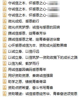 活动期间,学院学生积极响应,踊跃参与。大家紧扣主题,结合自身的经历与感悟,用真挚的文字阐述了对诚信的理解、资助政策对自己成长的影响以及如何在未来践行诚信理念。一篇篇征文饱含深情,展现了同学们自立自强、诚实守信的精神风貌,也体现了对国家资助政策的感恩之心。