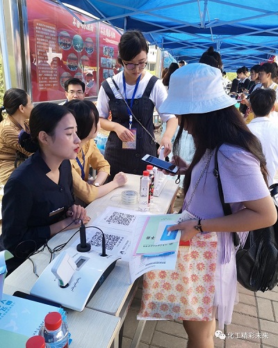 在迎新现场,志愿者们分工明确,从入学资格审查到新生信息登记,从新生材料收取到新生物品发放,一站式服务,井然有序。在校园里,更是处处可见迎新志愿者穿梭在校园里,热情细心地引导新生完成报到流程,帮助新生搬运行李,并积极介绍校园环境和大学生活经验。同时学院设置了家长休息处和饮水处,为新生及家长提供了极大的便利。除此之外,学院还有一项特色服务--皮肤检测,免费为大家进行皮肤含水量、皮肤红血丝、斑的检测,这项服务得到了大家的一致赞赏。