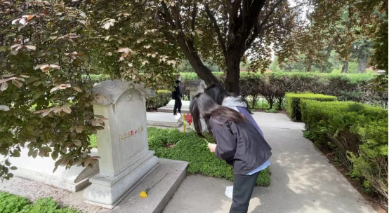在郑州烈士陵园前,同学们向革命烈士默哀三分钟致敬。面对英雄烈士墓,学生们纷纷鞠躬,表达了对烈士沉痛的哀悼和深切的思念,整个活动进行得庄严肃穆,井然有序。