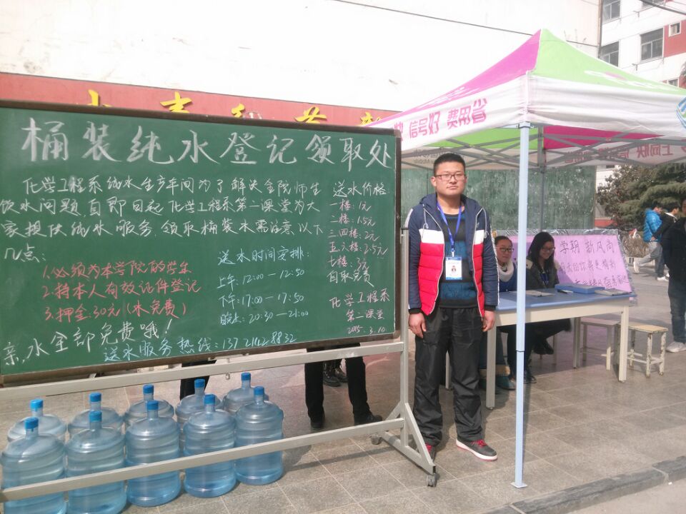 2015年3月10日,化学工程系第二课堂本着服务广大师生的理念,针对全校师生开展了免费发放桶装纯水活动。